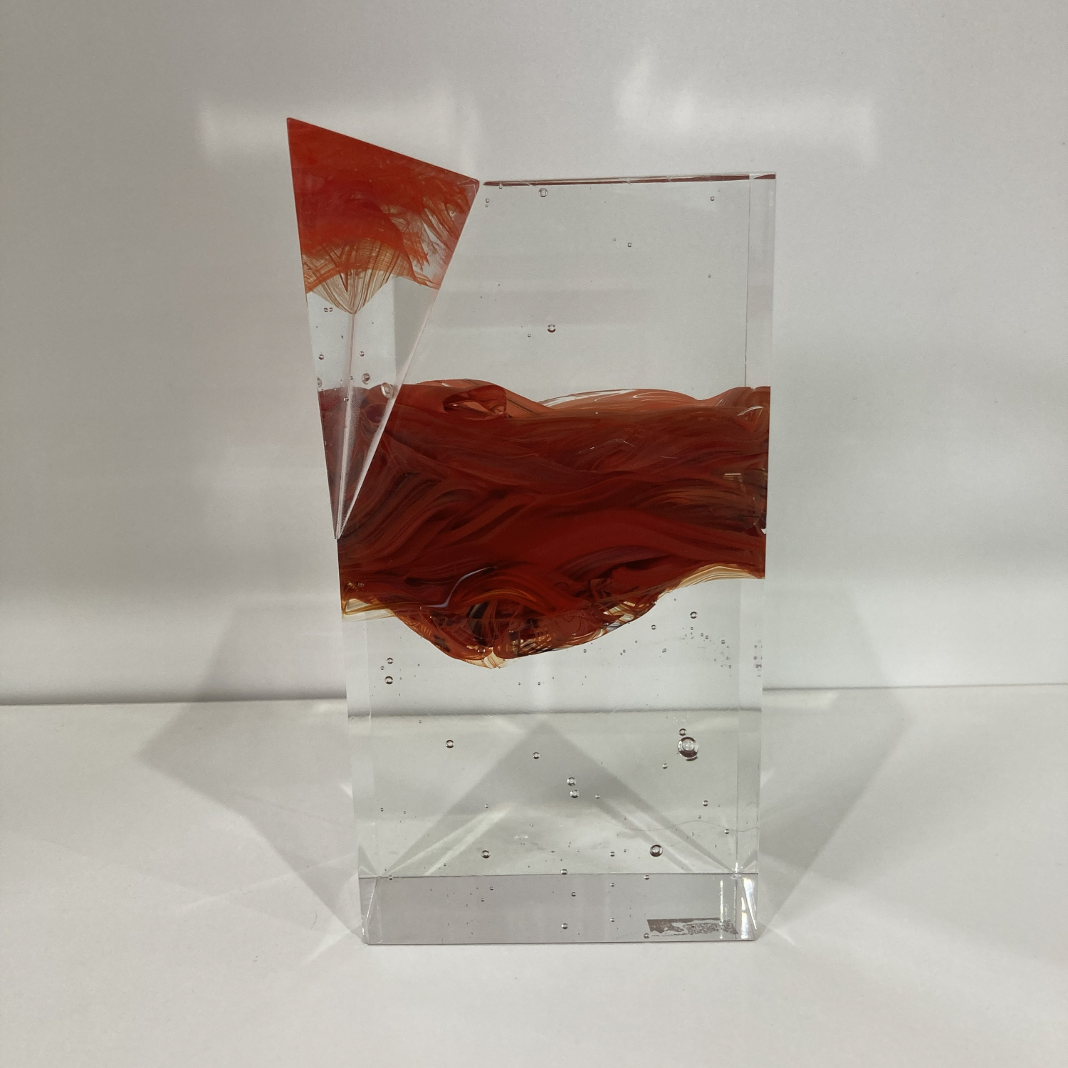 Křišťálově čirá hmota skla tvoří základ této precizně vybroušené plastiky, která je doplněna sytě červenými a oranžovými víry uvnitř hmoty. Tyto barevné proudy připomínají tekoucí lávu či rozvířenou energii, jakoby zamrzlou v čase. V horní části vystupuje výrazný geometrický prvek – ostrý červený čtyřstěn, jenž narušuje hladkou linii kvádru a zároveň umocňuje prostorový kontrast celého objektu.
