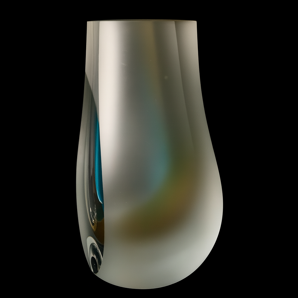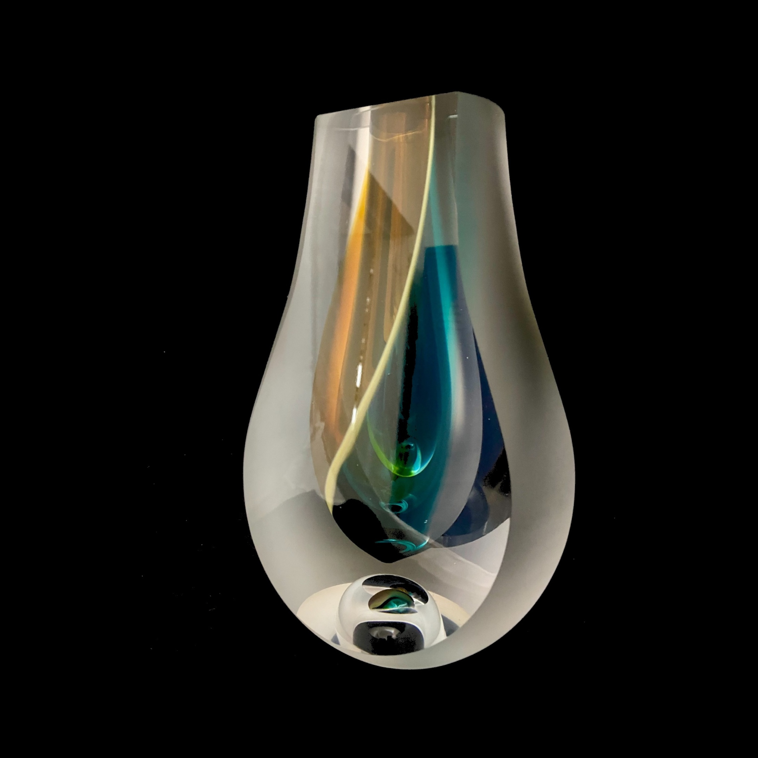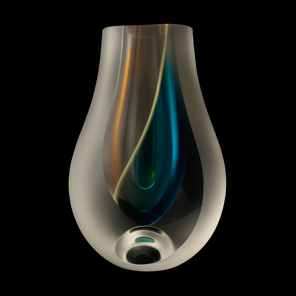 Váza Karla Malivánka představuje vrchol českého hutního sklářství, kde se snoubí precizní řemeslné provedení s uměleckou invencí. Ručně broušený povrch se střídá s dokonale leštěnými plochami, které odhalují vnitřní barevnou kompozici. Tvar kapky umocňuje dojem plynulosti a ladnosti, zatímco čistě černé pozadí při prezentaci zvýrazňuje hru světel a barev uvnitř skla.Barevná paleta vázy kombinuje teplý jantarový odstín s hlubokou modří a jemným zeleným akcentem. Tyto tóny se do sebe opticky vlévají, což vytváří pocit pohybu a proměnlivosti při různém dopadu světla. Zelená linka, jemně zakřivená uvnitř hmoty, dodává kompozici energii a dynamiku, přičemž připomíná stopu světla uzamčenou v čase.Každý detail tohoto díla dokládá mistrovství autora – od volby tvaru přes precizní broušení až po barevné vrstvení, které vzniká přímo při práci v huti. Váza tak není jen dekorativním předmětem, ale zároveň ztělesněním symbiózy mezi ohněm, sklem a lidským umem. Díky svému nadčasovému designu může být vnímána jak jako solitérní umělecký objekt, tak i jako součást sbírky současného českého sklářského umění.