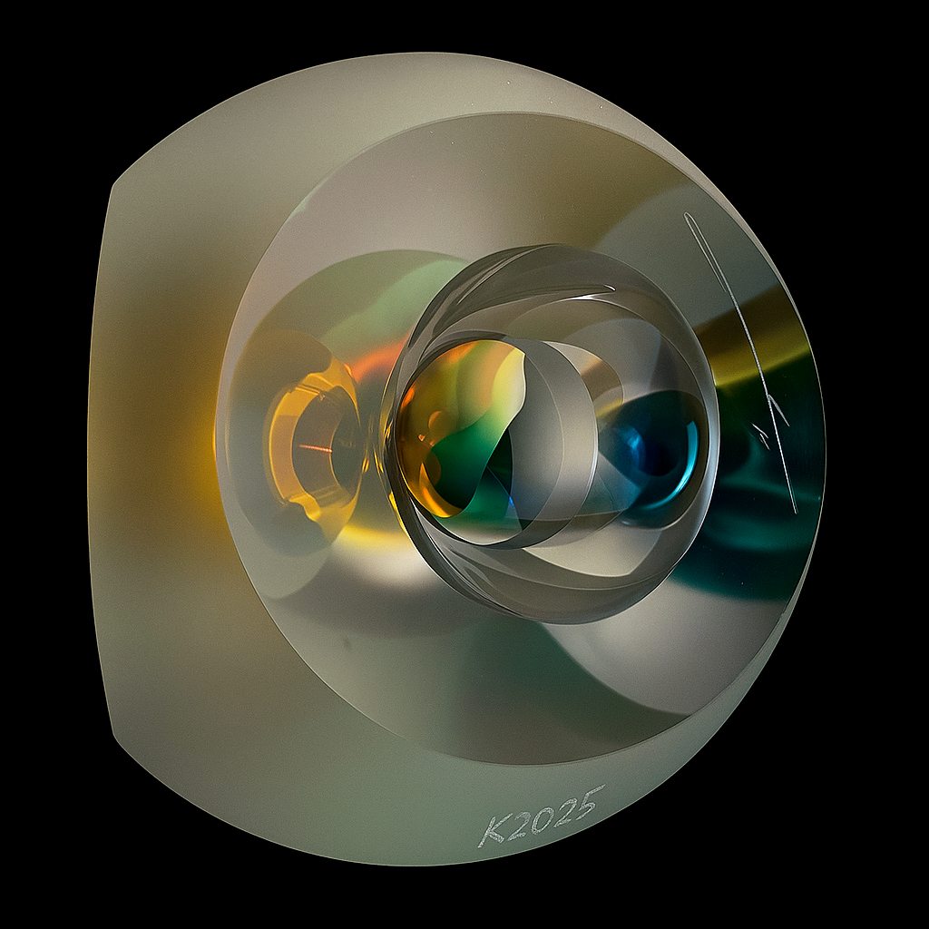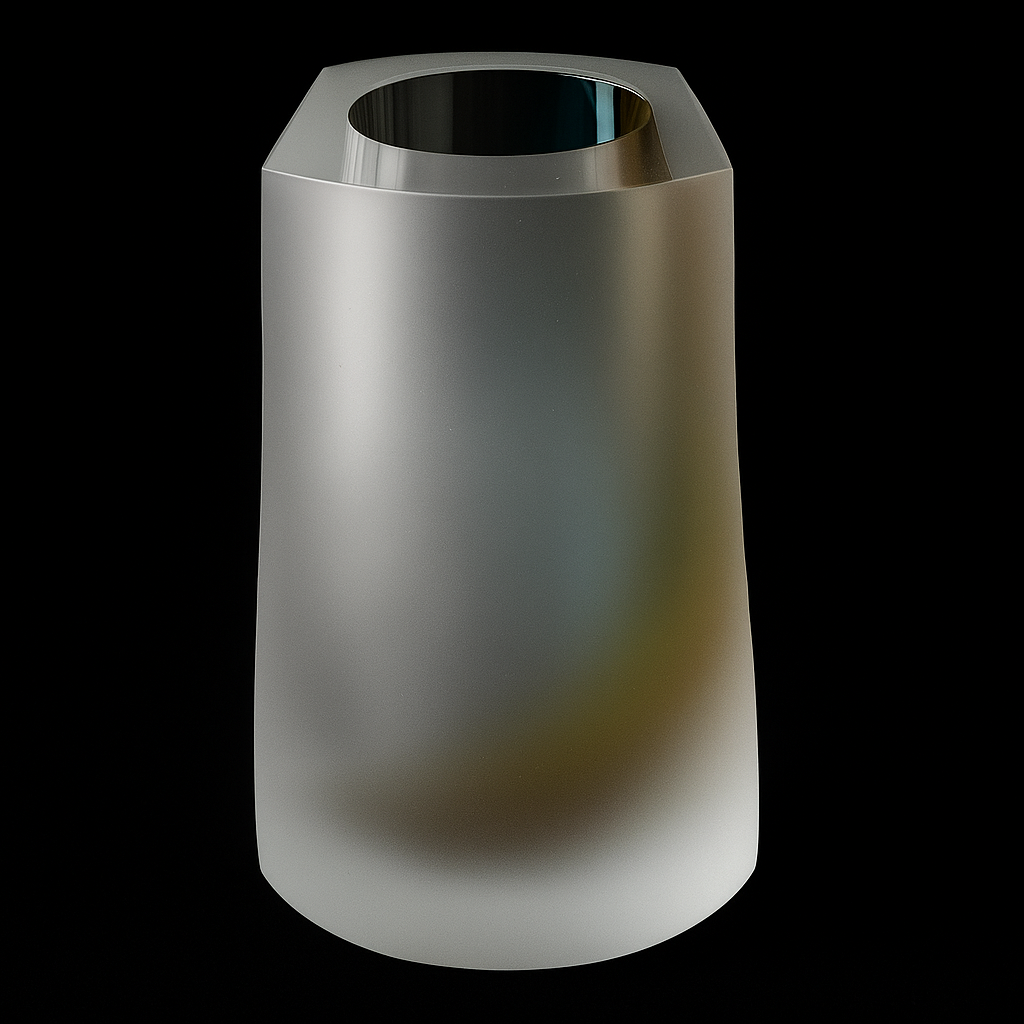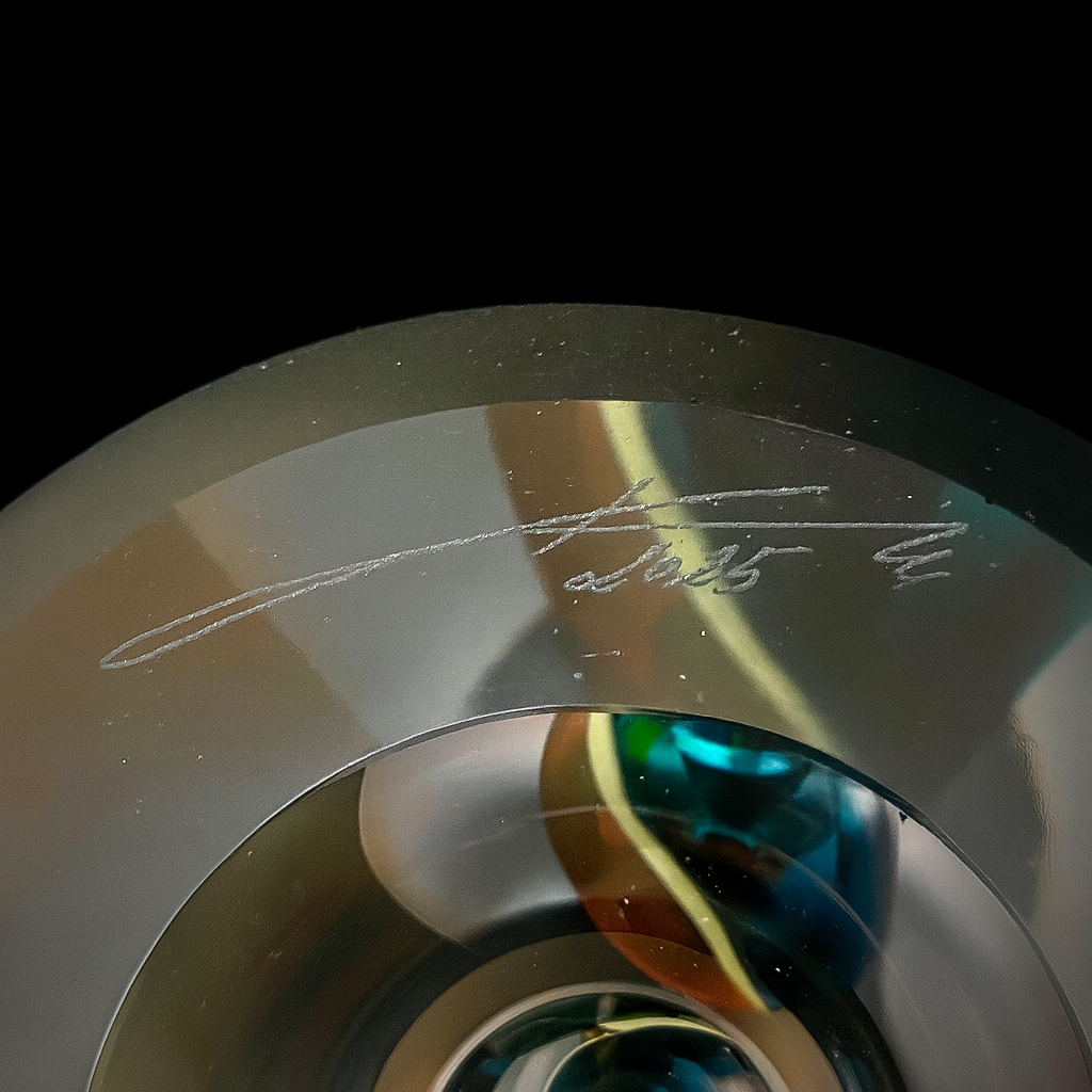 Váza Karla Malivánka představuje vrchol českého hutního sklářství, kde se snoubí precizní řemeslné provedení s uměleckou invencí. Ručně broušený povrch se střídá s dokonale leštěnými plochami, které odhalují vnitřní barevnou kompozici. Tvar kapky umocňuje dojem plynulosti a ladnosti, zatímco čistě černé pozadí při prezentaci zvýrazňuje hru světel a barev uvnitř skla.Barevná paleta vázy kombinuje teplý jantarový odstín s hlubokou modří a jemným zeleným akcentem. Tyto tóny se do sebe opticky vlévají, což vytváří pocit pohybu a proměnlivosti při různém dopadu světla. Zelená linka, jemně zakřivená uvnitř hmoty, dodává kompozici energii a dynamiku, přičemž připomíná stopu světla uzamčenou v čase.Každý detail tohoto díla dokládá mistrovství autora – od volby tvaru přes precizní broušení až po barevné vrstvení, které vzniká přímo při práci v huti. Váza tak není jen dekorativním předmětem, ale zároveň ztělesněním symbiózy mezi ohněm, sklem a lidským umem. Díky svému nadčasovému designu může být vnímána jak jako solitérní umělecký objekt, tak i jako součást sbírky současného českého sklářského umění.