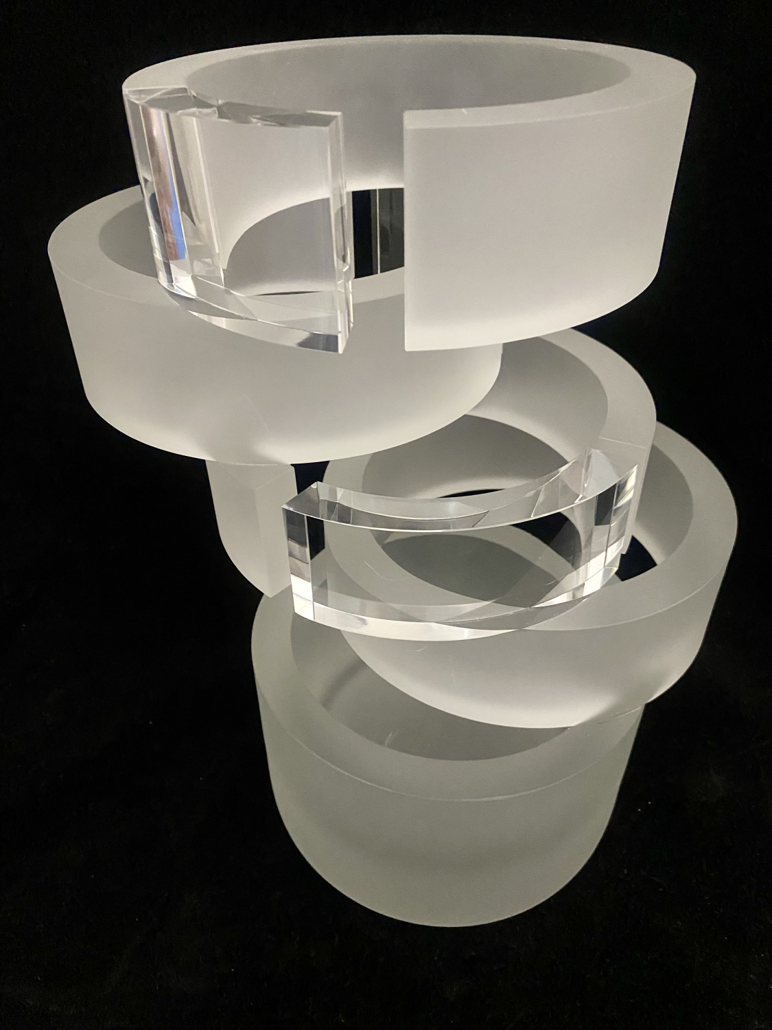 Tato 50 cm vysoká plastika z hutního skla je výjimečnou ukázkou technického mistrovství a estetické čistoty Karla Malivánka – jednoho z výrazných představitelů českého ateliérového skla. Kompozice je vytvořena z lepených bloků čirého optického skla, jejichž ruční výbrus a leštění vytvářejí ostré geometrické plochy, hranoly a přechody s maximální přesností.