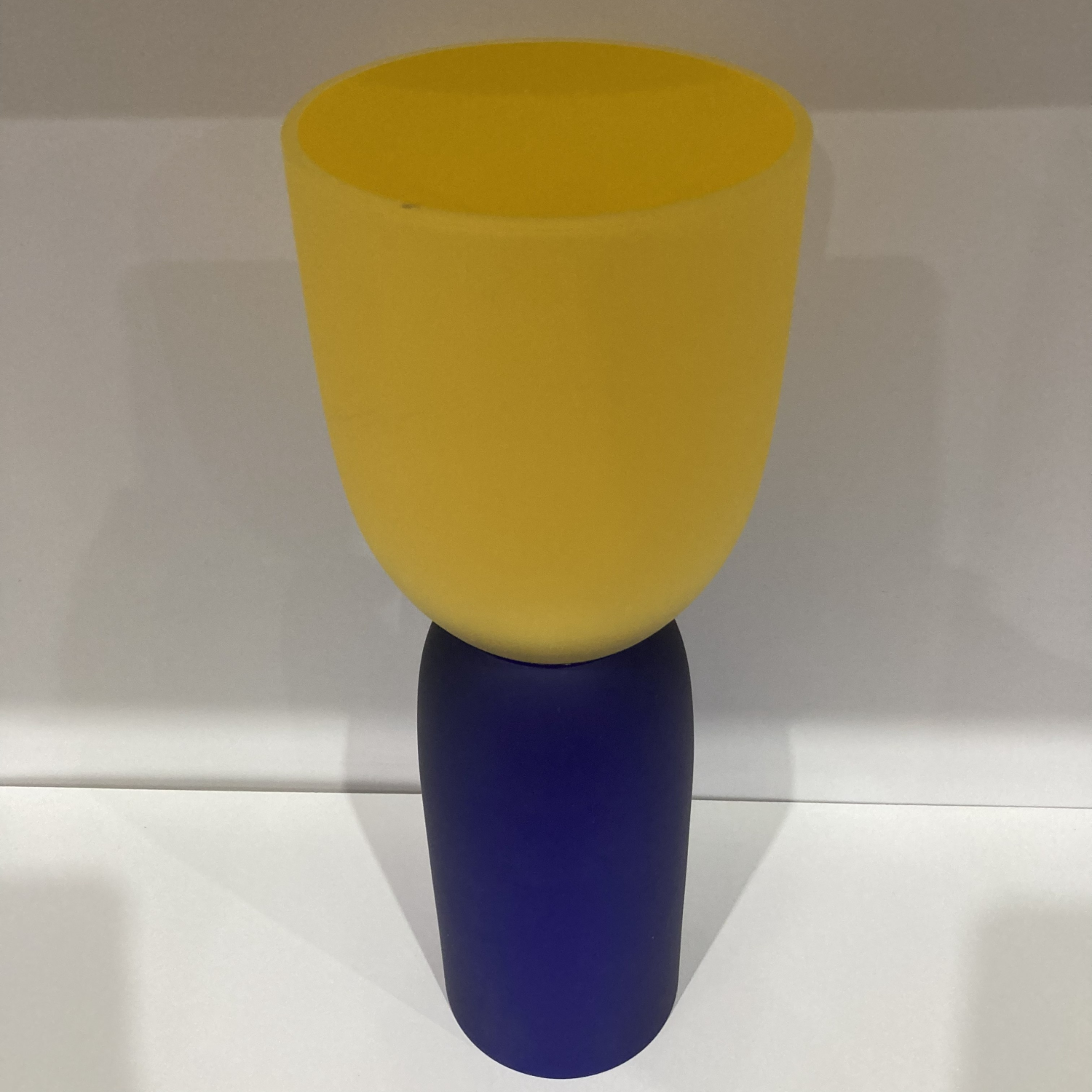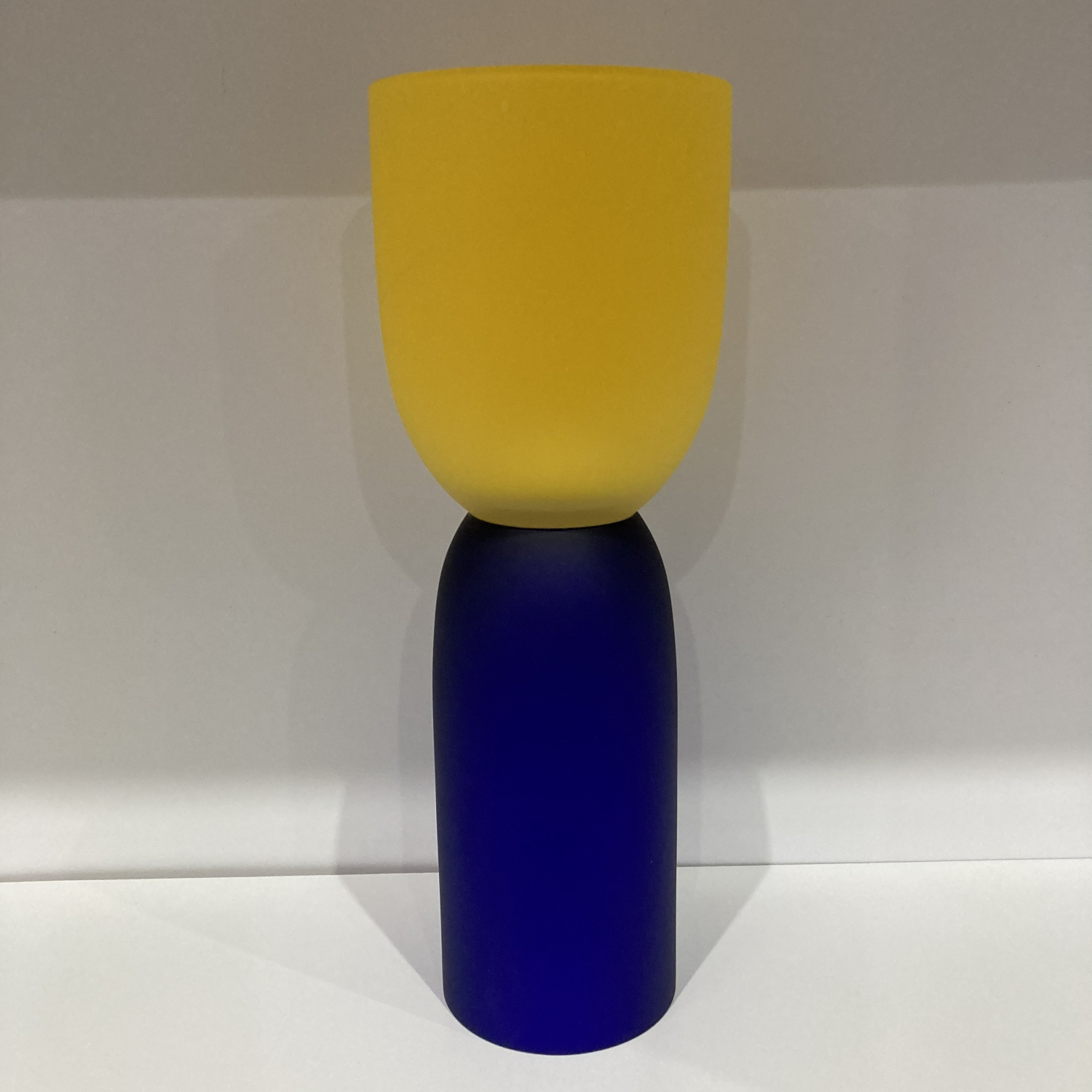 Váza je založena na čisté geometrické kompozici dvou základních objemů: horní vertikálně orientovaný válec přechází do spodní měkce modelované, oblou formy. Tato kombinace vytváří napětí mezi strohou racionalitou a organickou měkkostí tvaru. Proporčně je akcentována vertikála, která objektu dodává stabilitu i monumentalitu navzdory relativně komornímu měřítku.