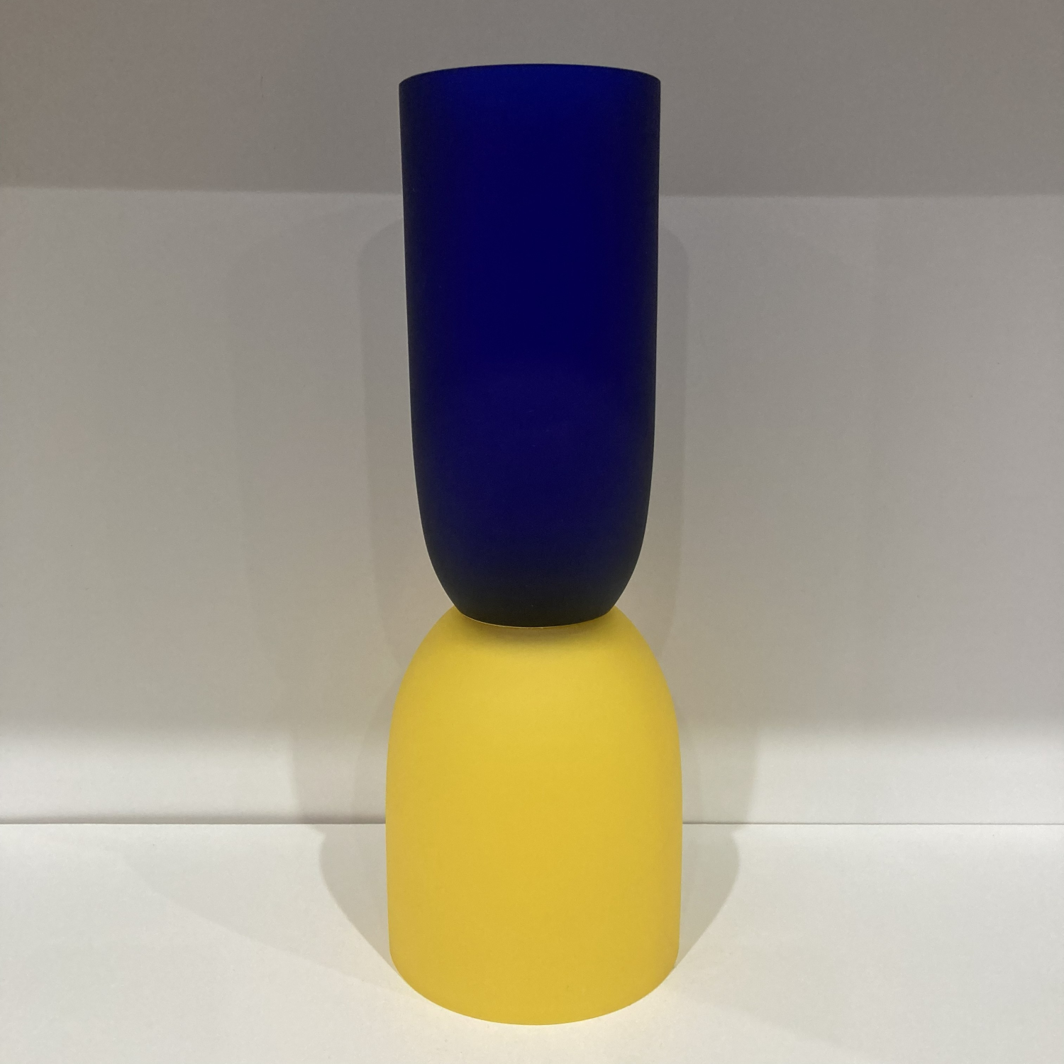 Barevné řešení pracuje s kontrastem sytých plných tónů – tmavá modř a výrazná žluť fungují jako komplementární dialog, který posiluje vizuální dynamiku a současně zdůrazňuje členění hmoty. Matný povrch eliminuje odlesky, čímž podporuje čitelnost objemu a soustřeďuje pozornost na tvarovou strukturu.
