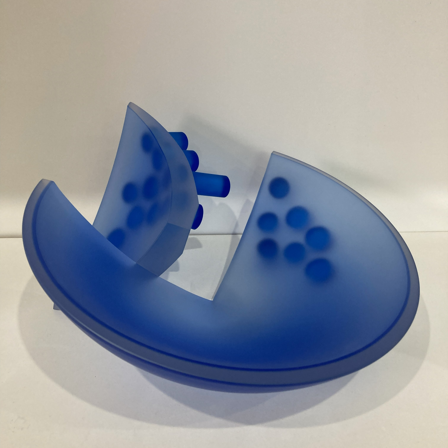 Modrá barva hraje klíčovou roli. Není dekorativní, ale kontemplativní – evokuje hloubku, chlad, odstup a ticho. V kombinaci s hmotností litého skla vzniká paradox: materiál je těžký a pevný, ale barevnost a světelné efekty v něm vyvolávají pocit ponoření a vnitřního prostoru. Světlo se uvnitř hmoty zpomaluje, láme a zdržuje, čímž se z plastiky stává spíše prostorová zkušenost než jen objekt.