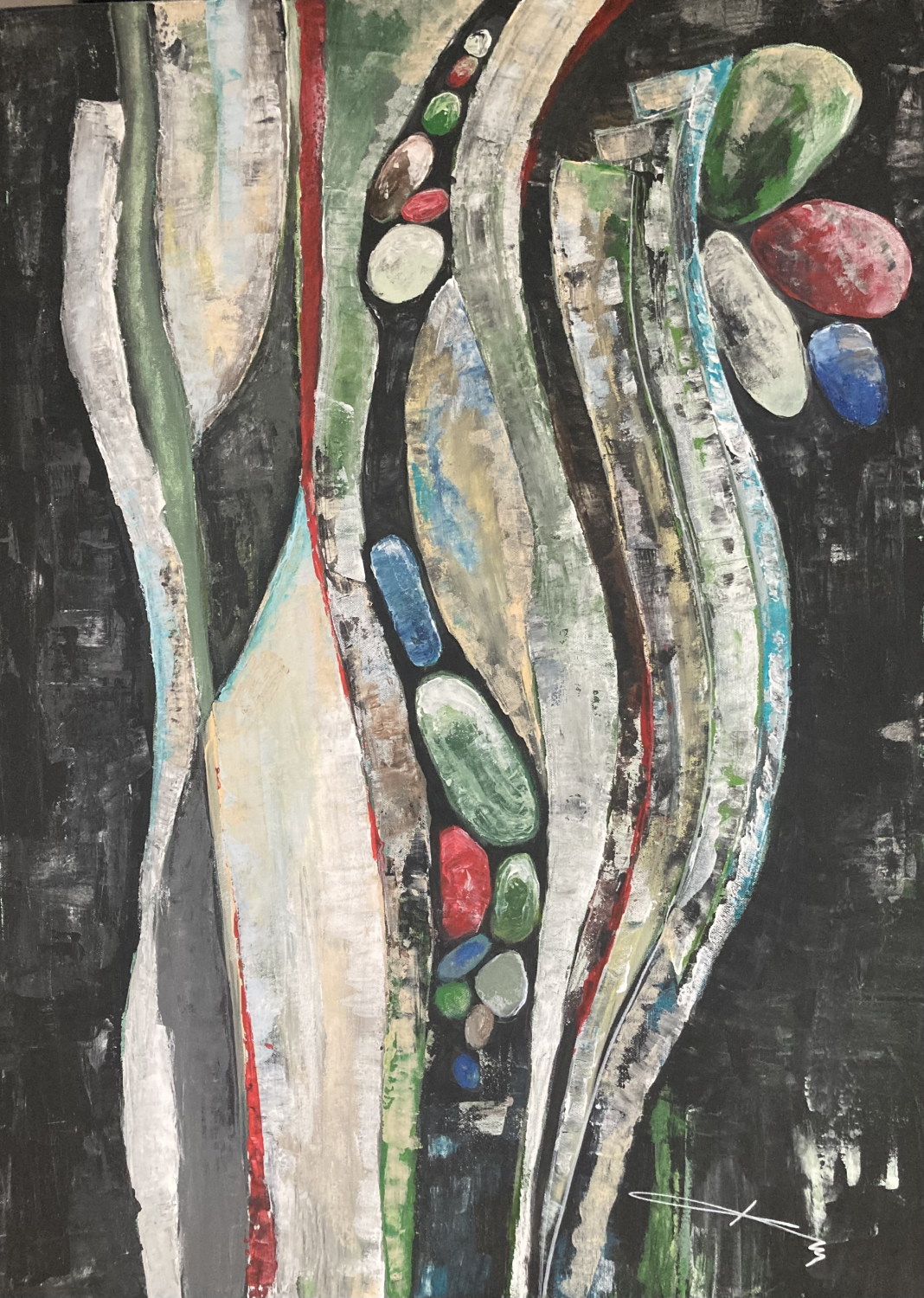 Tvorba Karla Malivánka je dlouhodobě charakteristická důrazem na organickou strukturu, živelný rytmus a schopnost abstrahovat přírodní procesy do vizuální podoby, která osciluje mezi geologií a vegetativním růstem. V tomto díle autor rozvíjí svou osobitou malířskou řeč prostřednictvím vertikální kompozice, jež působí jako záznam proudění – ať už jde o proudění energie, času nebo přírodních sil.Malivánek pracuje s akrylovou vrstvou s výraznou senzitivitou k materiálu: nechává barvu usazovat, narušovat, překrývat a znovu objevovat se v subtilních nuancích. Charakteristické oválné tvary, připomínající kameny či embryonální útvary, fungují jako nositelé kontinuity v jinak dynamickém pohybu obrazové plochy. Tmavé pozadí se stává prostorem, v němž autor modeluje světlo, texturu a rytmus, a jehož hloubka podtrhuje dramatickou energii celého díla.Pro Malivánkovu tvorbu je typické hledání rovnováhy mezi spontánností a strukturou. Stejně tak i zde dochází k napětí mezi kontrolovaným gestem a instinktivní malířskou stopou. Výsledný obraz není pouhou abstrakcí, ale vizuálním otiskem procesů, které často zůstávají skryté očím – ať už jde o geologické vrstvení, růstové cykly nebo vnitřní psychické proudy.Kurátorským záměrem této prezentace je zdůraznit Malivánkovu schopnost převádět skryté rytmy přírody do symbolických struktur, které mají jak hmatatelnost, tak duchovní potenciál. Dílo vybízí diváka ke kontemplaci, k vnímání jemných posunů, k hledání živosti v abstraktní kompozici. Malivánkův obraz je tak nejen estetickým objektem, ale i prostorem pro setkání s energií, jež přesahuje běžnou vizuální zkušenost.
