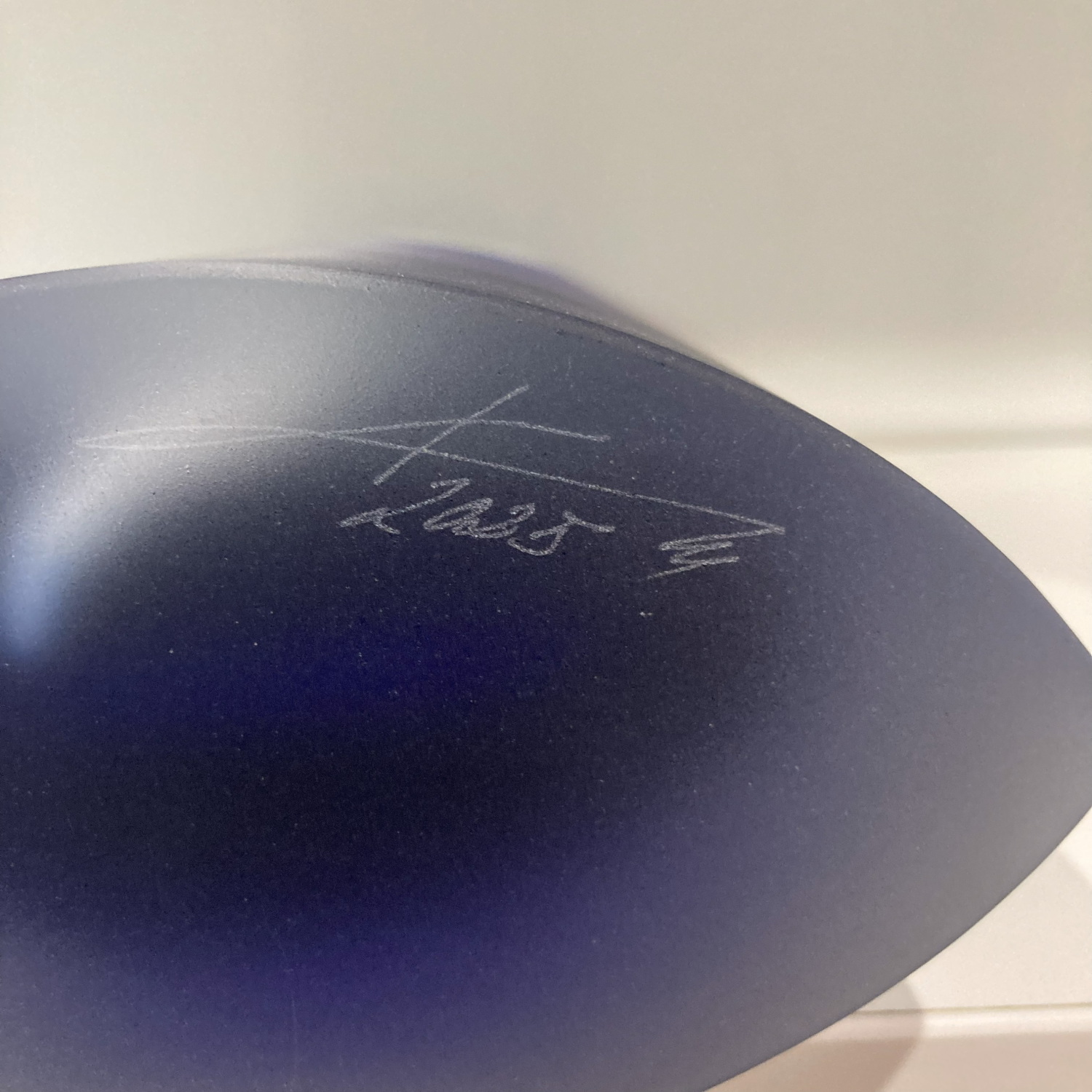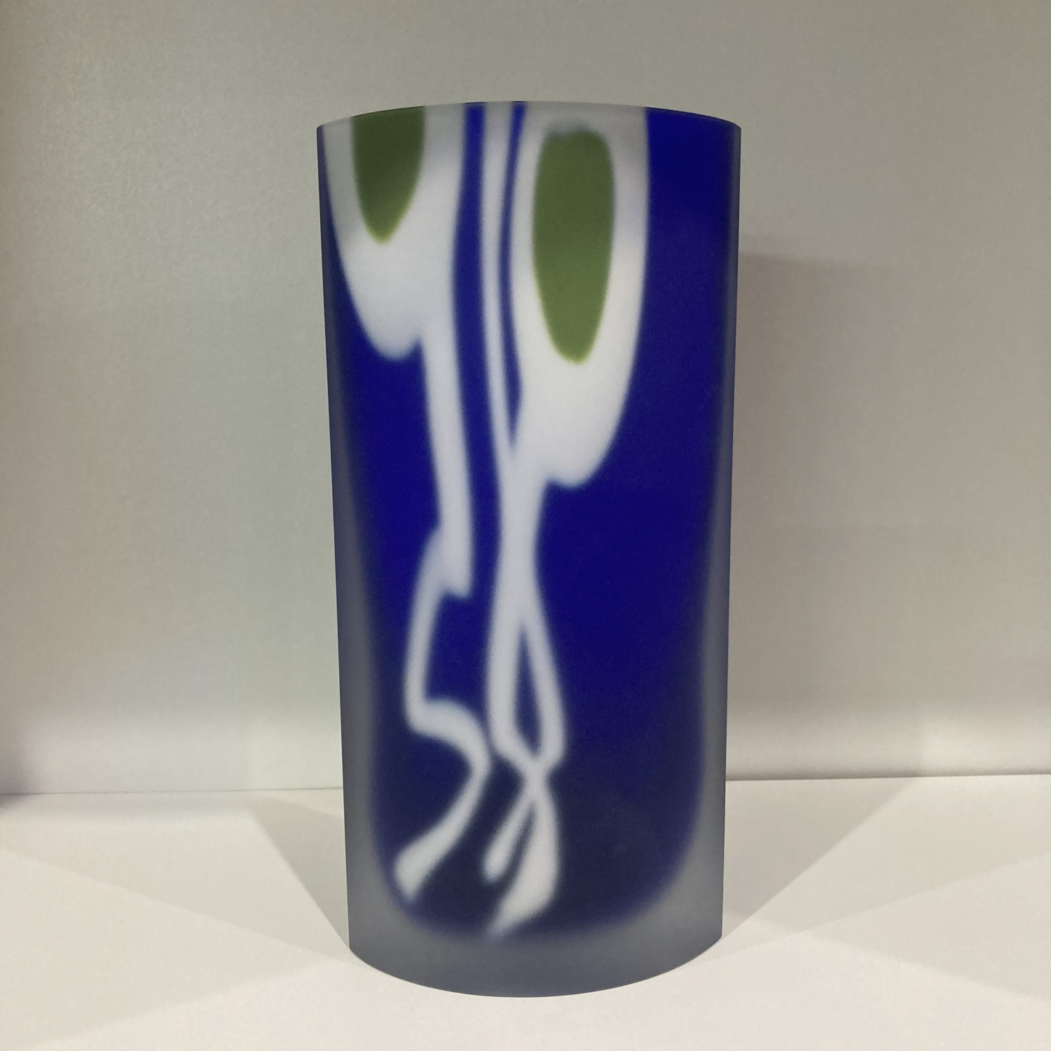 Broušená váza ve tvaru elipsy s matným povrchem zdobená převážně bílou opálovou a zelenou rubínovou barvou.