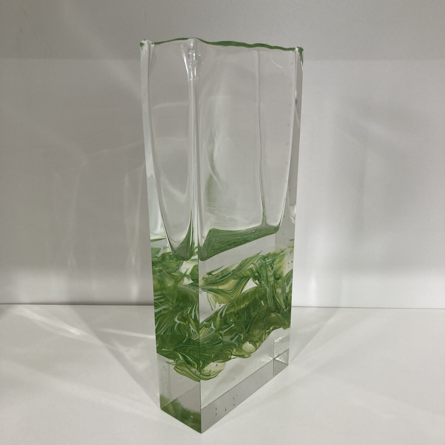Váza z dílny Karla Malivánka je příkladem českého ateliérového skla, v němž se střetává přísná geometrie formy s organickou, živelnou strukturou hutního dekoru. Transparentní blok funguje jako optické prostředí, které uzavírá a znásobuje pohyb zelené skloviny, evokující přírodní motivy – proudění, vegetaci či krajinu. Dílo pracuje s napětím mezi klidem tvaru a dynamikou vnitřního děje a zdůrazňuje světlo jako aktivní součást výrazu. Váza tak překračuje užitou funkci a blíží se autonomní skleněné plastice.