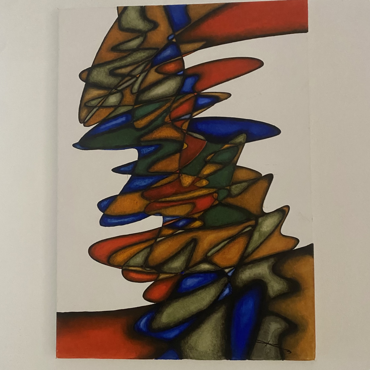 Obraz pracuje s kontrastem mezi čistým bílým pozadím a spletitou sítí barevných segmentů, oddělených výraznou černou linií. Tato linie funguje jako pevná kostra, která drží pohromadě dynamický celek tvarů, jež působí téměř sochařsky. Barevná paleta je intenzivní a harmonická – od syté červeně přes hlubokou modř po zelené a zlatohnědé tóny. Organické formy se vzájemně prolínají, přetékají a vrství, což vytváří dojem neustálého proudění. Kompozice může evokovat jak mikroskopický pohled na buněčné struktury, tak abstraktní záznam pohybu nebo zvuku. Dílo má silnou vizuální energii, ale zároveň díky opakování tvarů a barev nabízí i stabilitu a řád. Výsledkem je obraz, který lze vnímat jako meditaci nad harmonií chaosu – místo, kde se divoká energie a pevná struktura setkávají v křehké rovnováze.