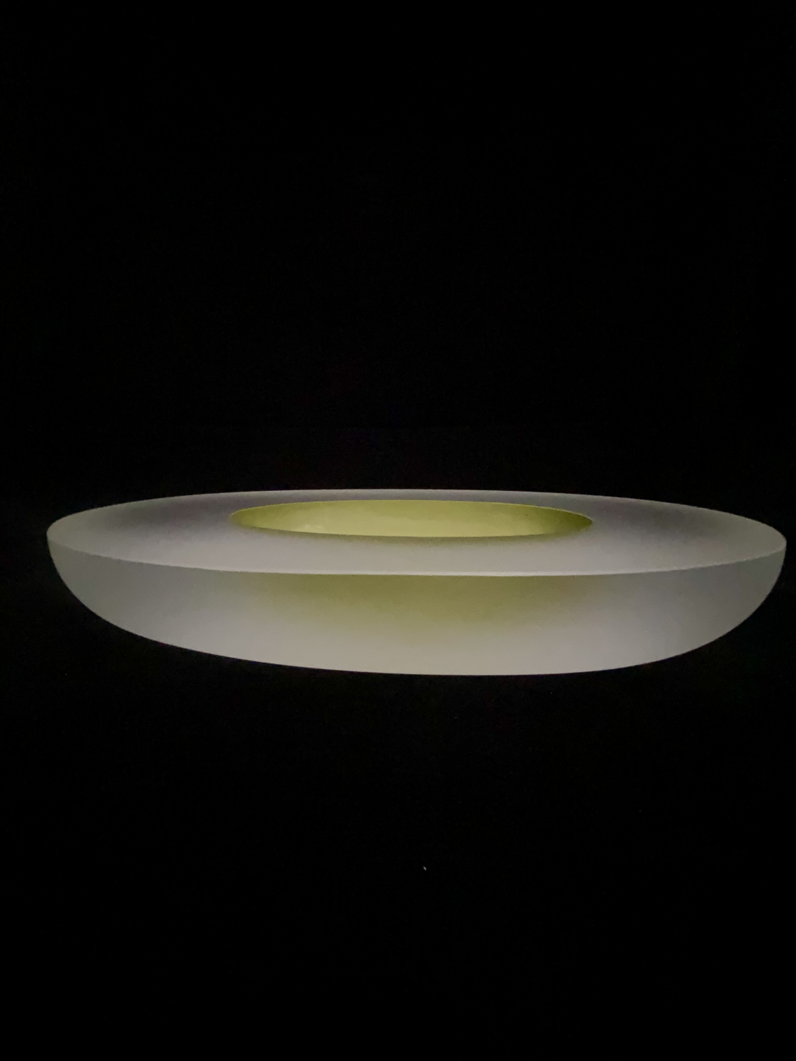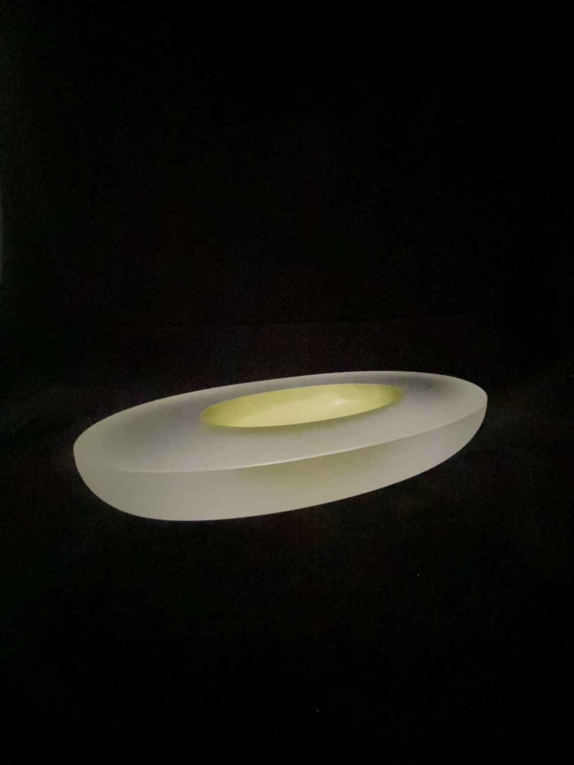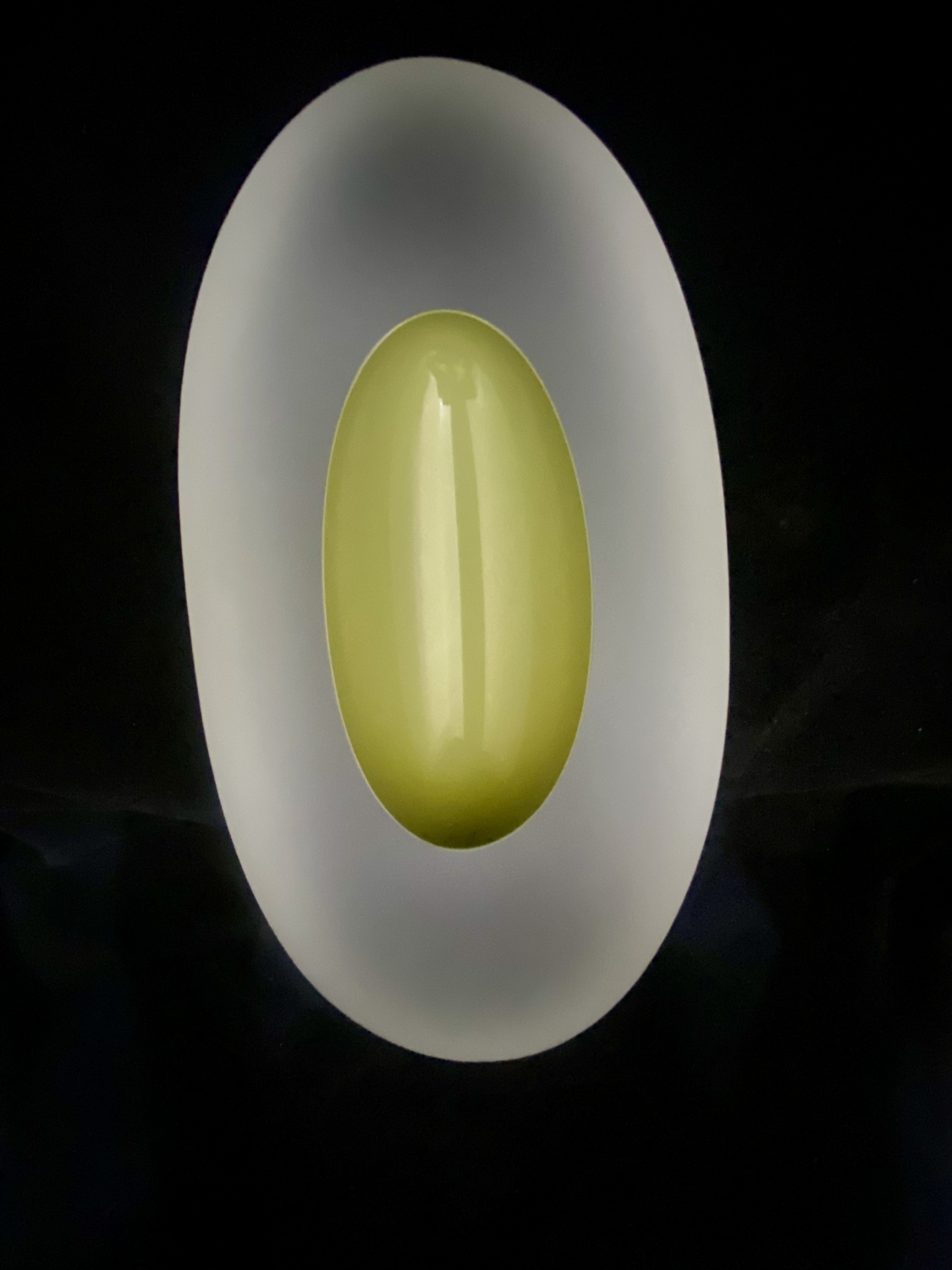 Tato skleněná váza Karla Malivánka z roku 2024 představuje vrcholnou ukázku minimalismu a precizního řemesla v současném českém ateliérovém skle. Váza je tvarována do horizontálně uložené eliptické formy s lehce zešikmeným horním okrajem, čímž získává subtilní dynamiku a optickou lehkost. Je vyrobena z masivního optického skla, které bylo ručně broušeno do saténově matného povrchu na vnější straně, zatímco vnitřní dutina je hladce leštěná a nese jemné zelené jádro. Tento světelný akcent působí dojmem, že objekt vyzařuje vlastní zář – od středu směrem ven.